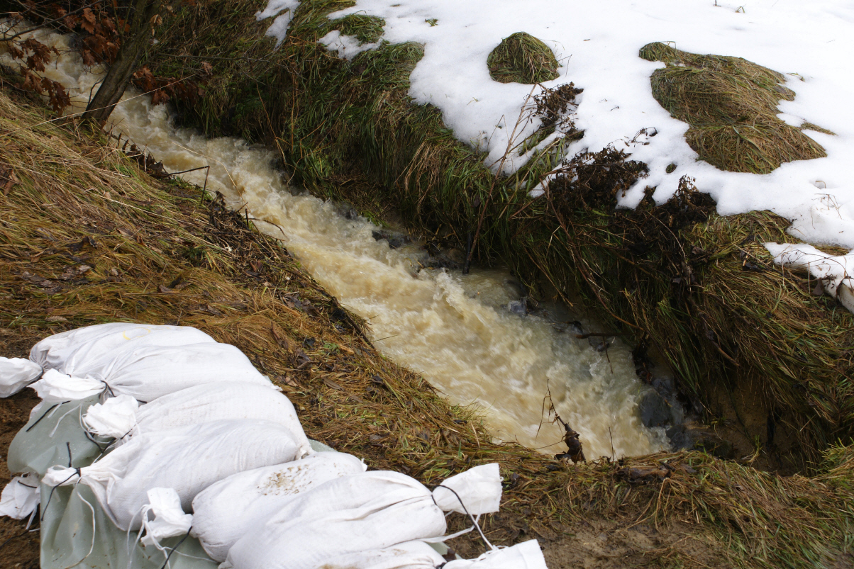 Ottendorf, 18.40 Uhr: Mehrere Wasserdurchflüsse, die wegen der starken Regenfälle und Unmengen an Tauwasser überzulaufen drohten, wurden gereinigt und eine Kontrollfahrt durch den Ort unternommen.