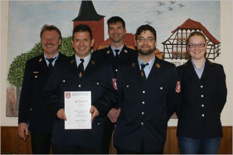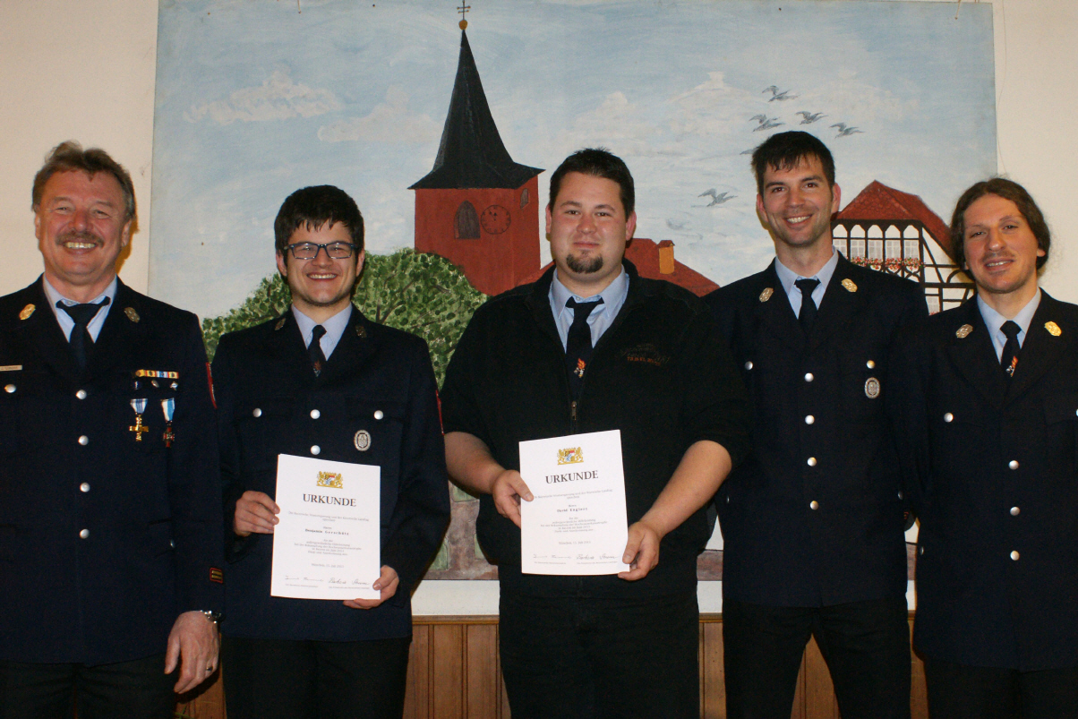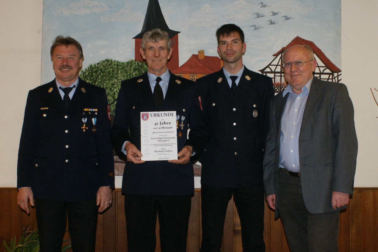 Der erste Vorsitzende Christoph Sperber gab bekannt, dass der Feuerwehrverein derzeit 80 Mitglieder beherbergt. Gleich mehrere Ehrungen standen zudem auf der Tagesordnung. Für 25 Jahre treue Mitgliedschaft im Feuerwehrverein wurde Bernd Vollert von der Vorstandschaft mit einer Urkunde ausgezeichnet. Nach 41 Jahren und 9 Monaten wurde außerdem der Ehrenkommandant Manfred Vollert aus dem aktiven Feuerwehrdienst verabschiedet, da er die Altersgrenze von 63 Jahren erreicht hatte. In seiner langen Amtszeit als zweiter bzw. erster Kommandant Da sie im Juni 2013 zusammen mit dem Hilfeleistungskontingent der Haßberg-Feuerwehren zwei Tage lang in Bereitschaft standen, um jederzeit ins Hochwassergebiet bei Passau ausrücken zu können, wurden Benjamin Gerschütz und David Englert nun mit dem "Fluthelfer 2013"-Abzeichen und einer Urkunde ausgezeichnet. Über 80 Feuerwehrleute standen damals im Landkreis mit gepackten Taschen und beladenen Fahrzeugen bereit und warteten auf den endgültigen Einsatzbefehl. Allerdings verzichtete die Einsatzleitung Passau dann kurzfristig doch darauf, das Kontingent anzufordern.