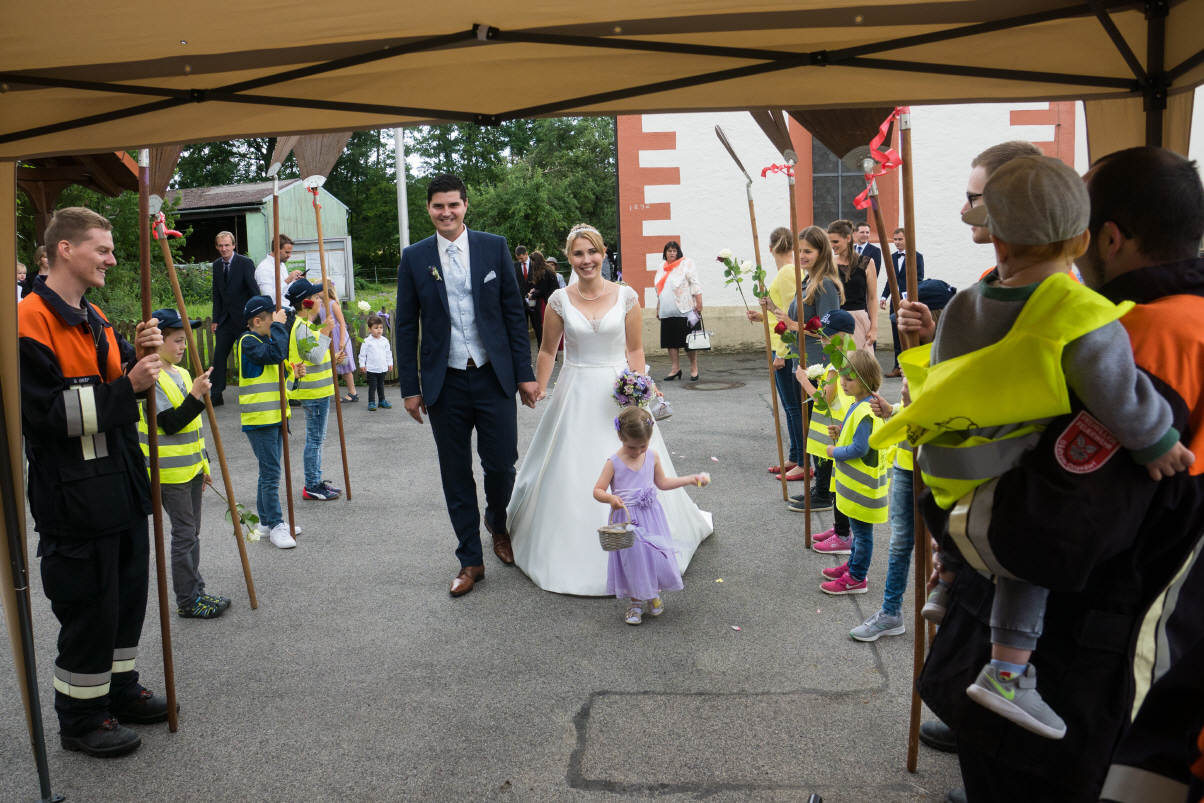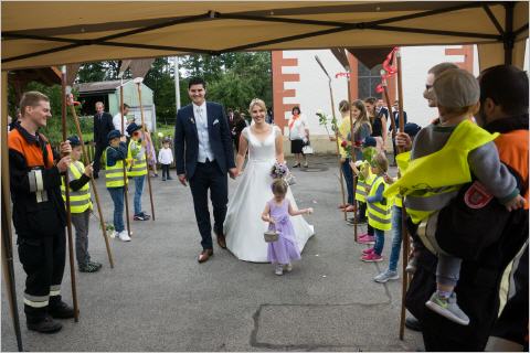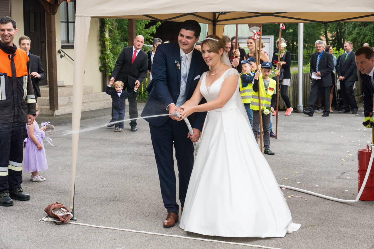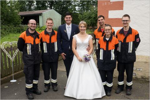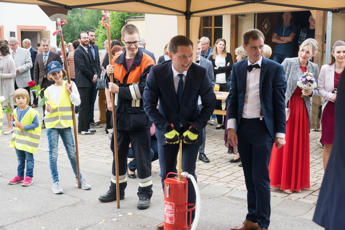 Am 13. Juli machten sich aktive Wehr, Feuerwehrverein Ottendorf und die Kinderfeuerwehr auf nach Römershofen, um unsere Kameraden Lena und Simon Schuhmann nach ihrer Trauung vor der Kirche zu empfangen. Neben dem traditionellen Feuerpatschen-Spalier durfte natürlich auch das Zielspritzen mit der Kübelspritze nicht fehlen!
