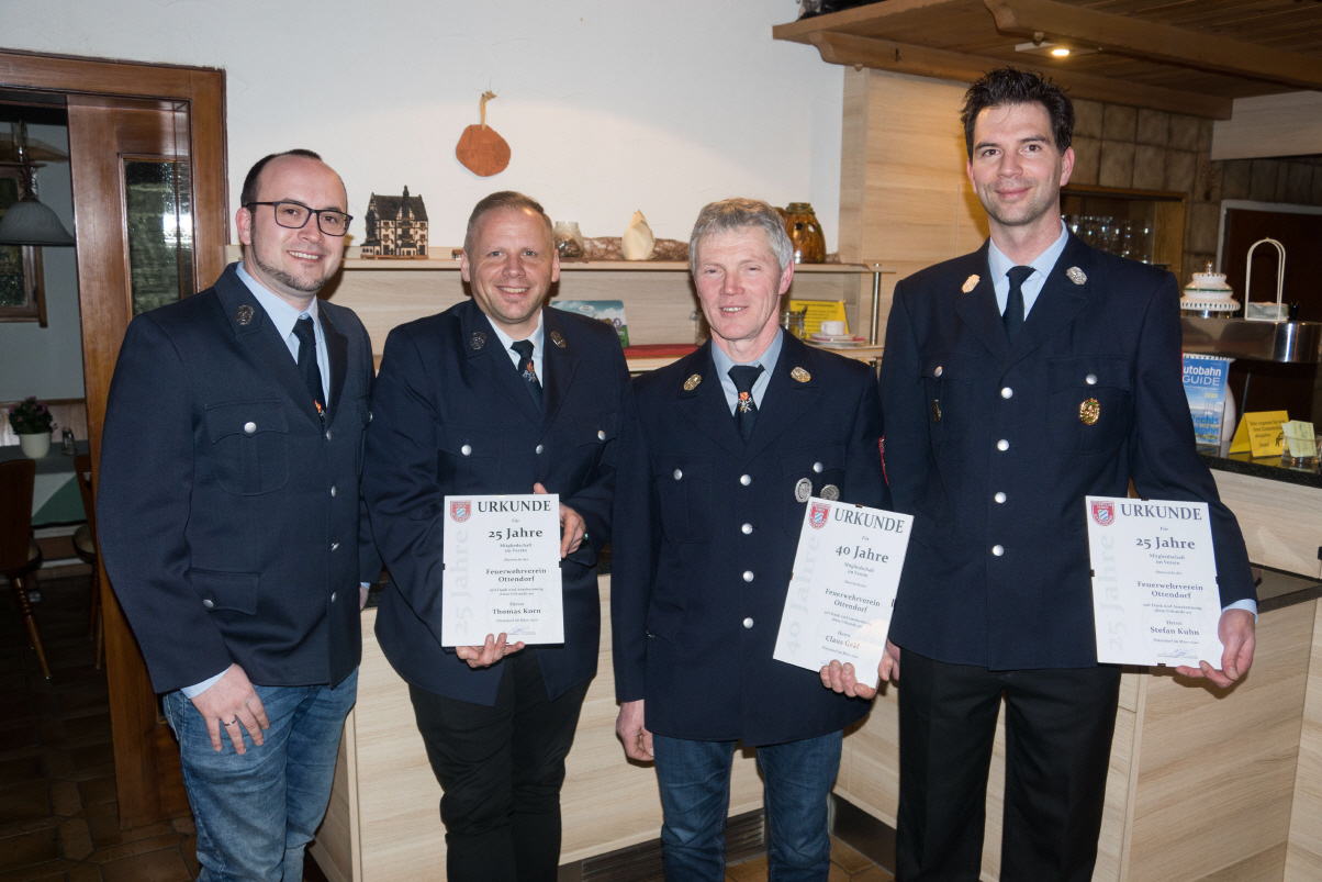 Eine besondere Ehre war es für die Vorstandschaft, auch in diesem Jahr wieder treue Mitglieder für ihre langjährige Vereinszugehörigkeit und ihr Engagement auszeichnen zu können. Hier erhielten Claus Gräf für 40 Jahre sowie Stefan Kuhn und Thomas Korn für 25 Jahre im Feuerwehrverein je eine Urkunde sowie ein kleines Geschenk. Ihre Ehrung leider nicht persönlich entgegennehmen konnten Martin Heinlein (40 J.) sowie Christian und Markus Pfülb (25 J.).