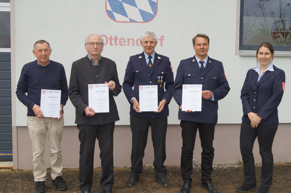 Lena Schuhmann, 1. Vorsitzende, nahm die Jahresversammlung im Ottendorfer Feuerwehrhaus außerdem zum Anlass, verdiente Mitglieder für ihre langjährige Treue zum Verein zu ehren. Unter großem Applaus der anwesenden Mitglieder wurden geehrt: Richard Gräf für 65 Jahre Zugehörigkeit, Rüdiger Gräf für 40 Jahre, Manfred Vollert für 50 Jahre sowie Herbert Kreb, der die Urkunde für 40 Jahre erhielt. Günter Metz, der nicht anwesend sein konnte, wurde nachträglich für 50 Jahre im Verein ausgezeichnet.